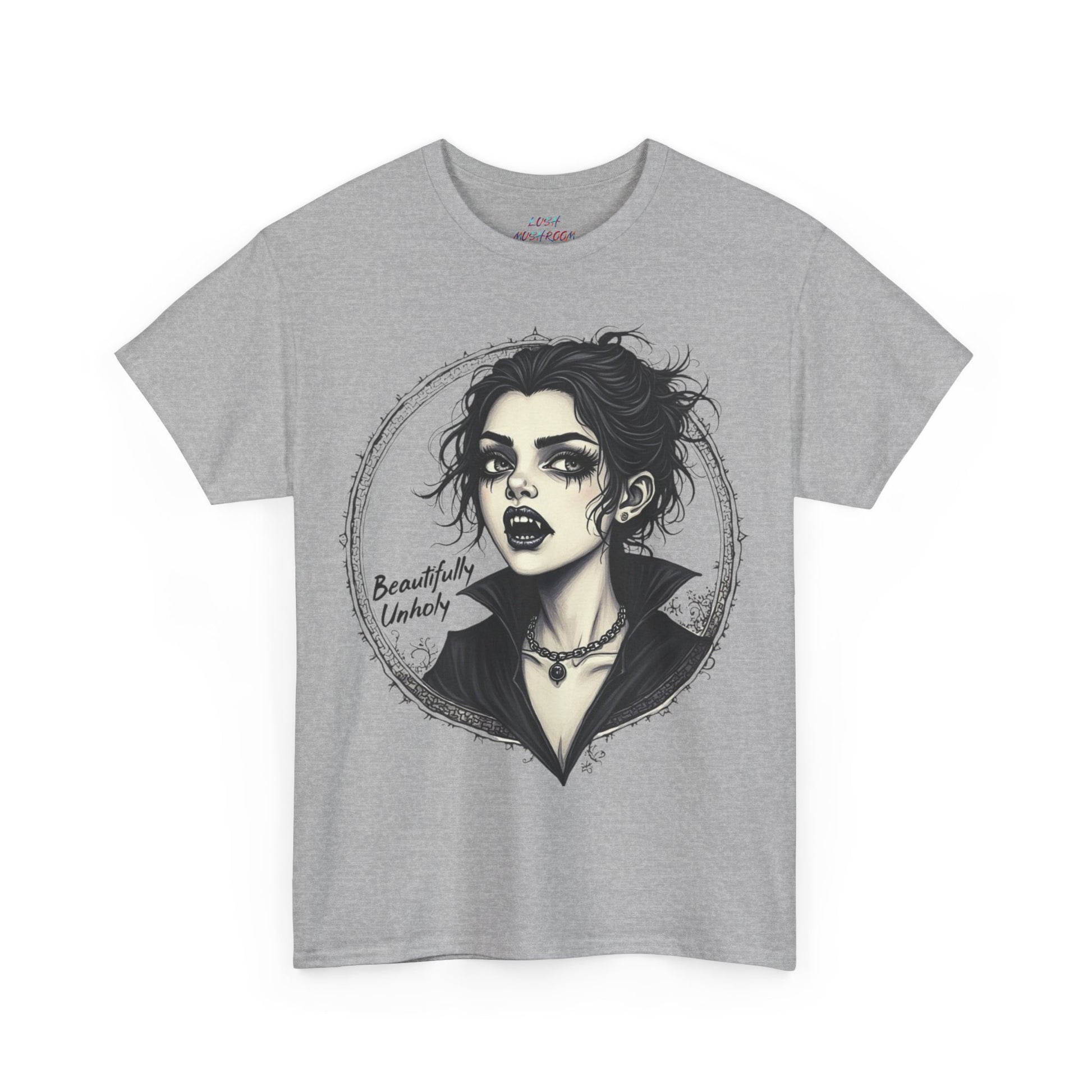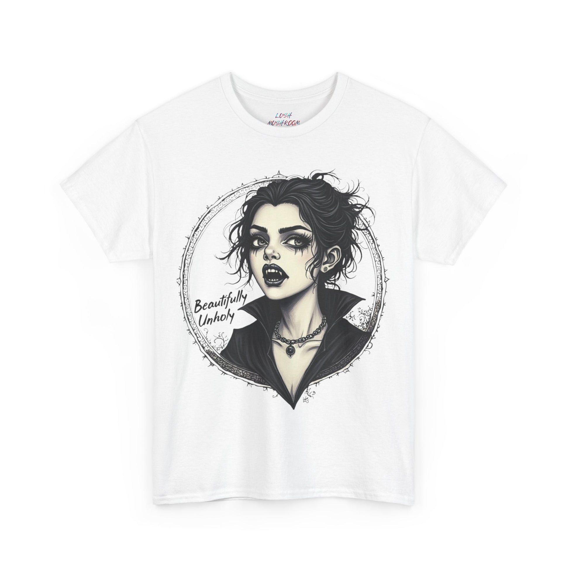 A soft, breathable cotton tee printed with a striking black-and-white portrait that channels moody, gothic energy. The artwork—an expressive, ink-style female face framed by a thorny circle—sits centered on the chest for bold, wearable art. It wears in like a lived-in favorite: the medium-weight fabric holds prints crisply while staying comfortable across seasons.