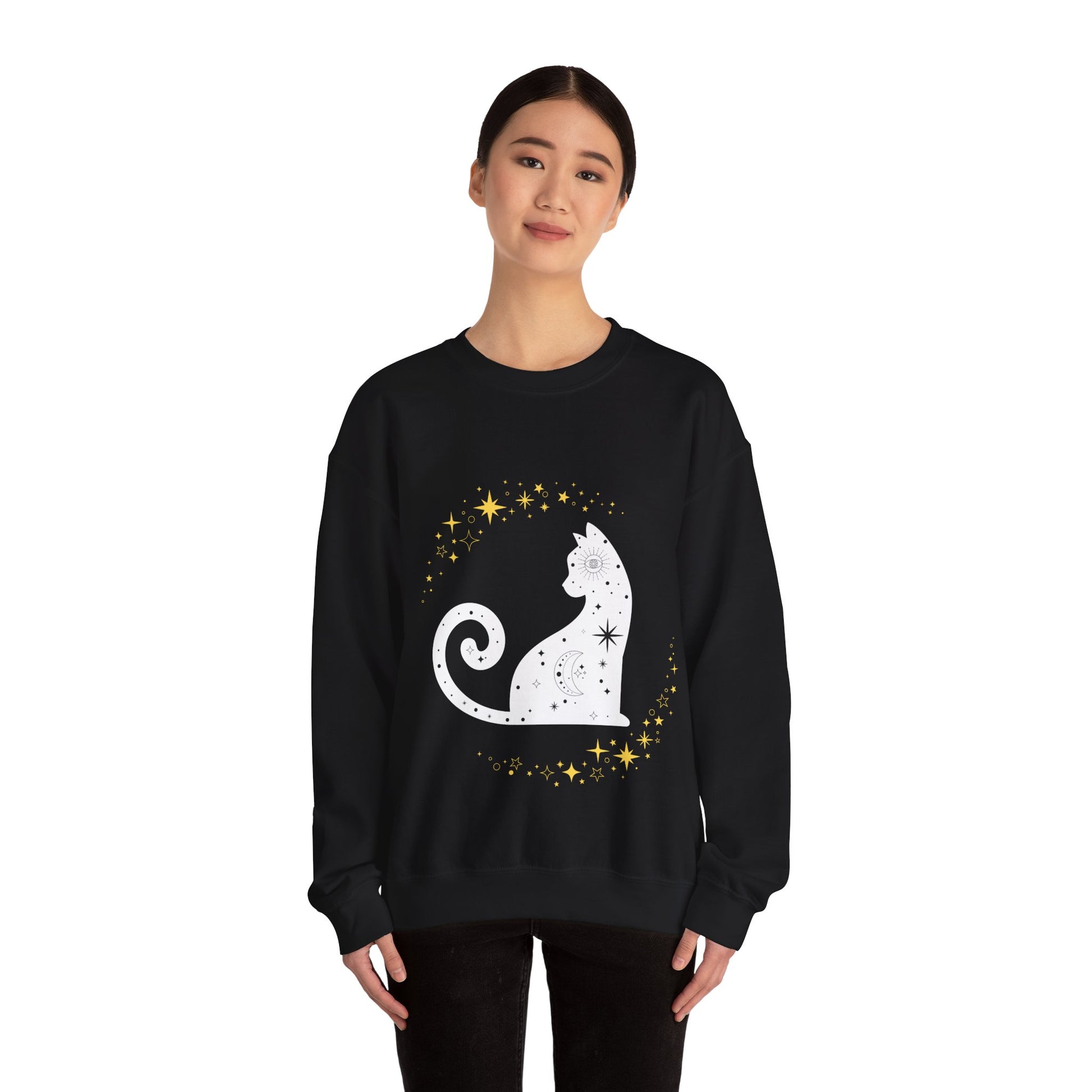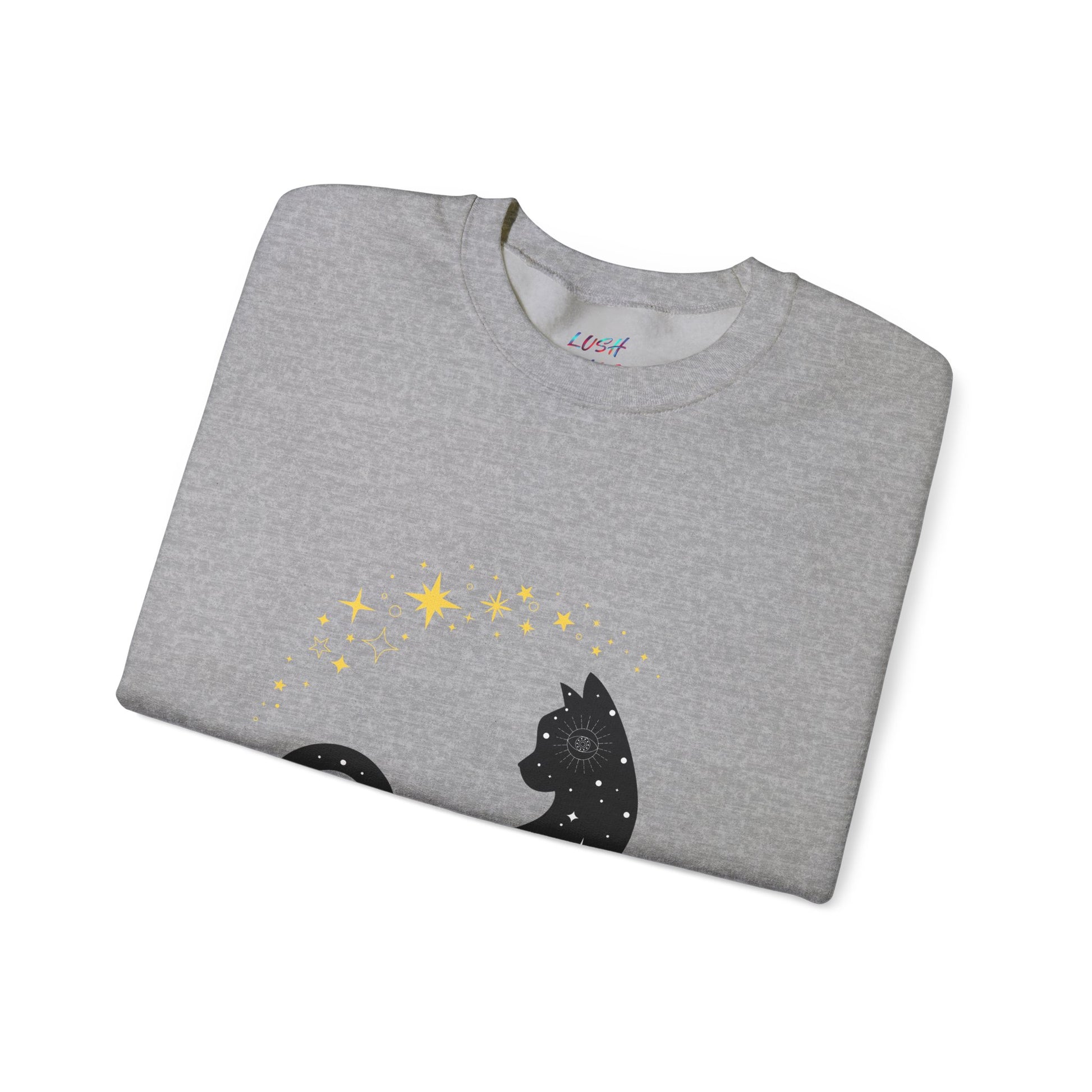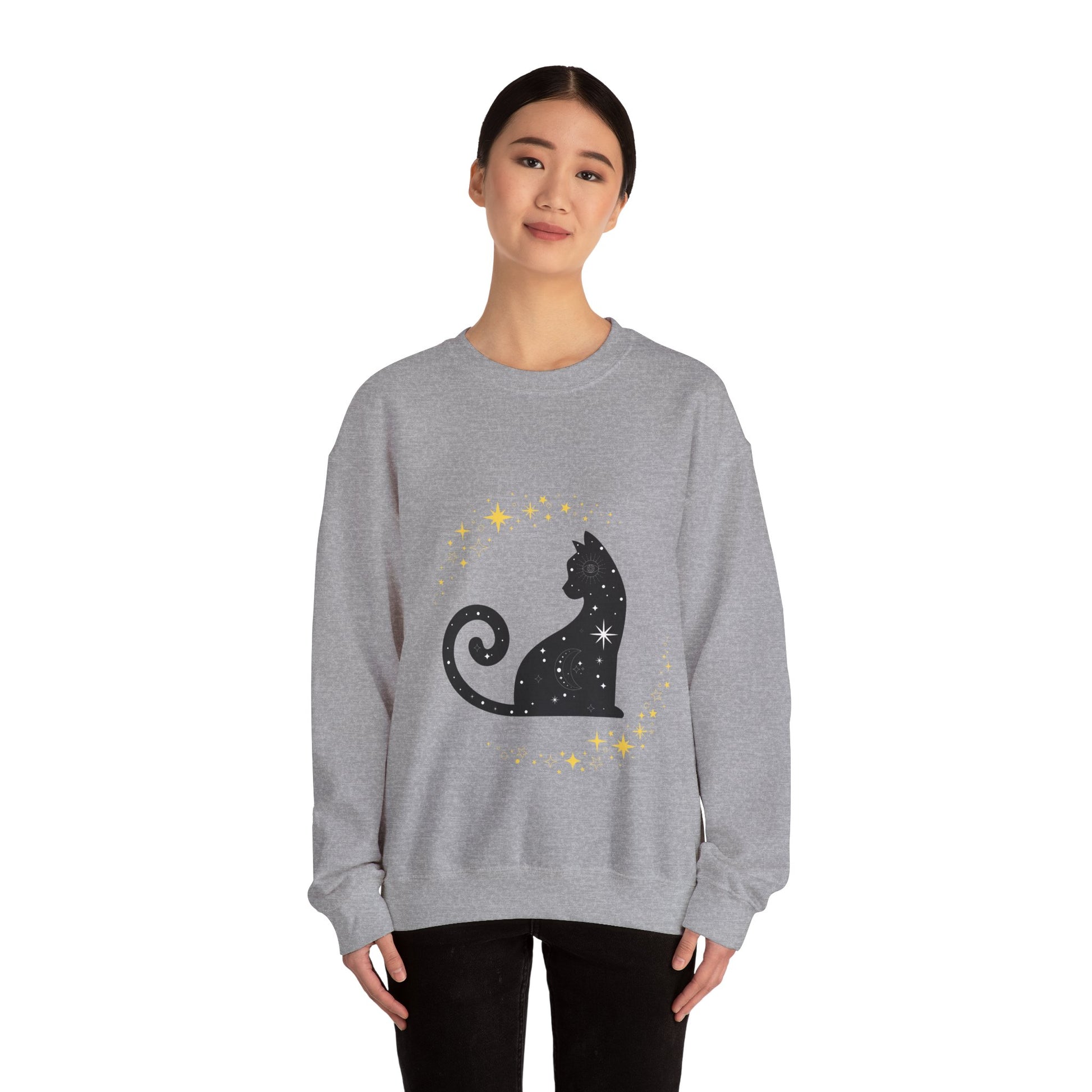 Soft, cozy, and quietly magical — this crewneck wraps you in a familiar comfort while whispering a little wonder. The sweatshirt features a silhouetted cat filled with tiny stars and a few golden sparkles, a simple design that reads like a private charm. It sits easy across shoulders and chest, the classic crew neckline and relaxed fit making it a go-to layer for slow mornings, late-night reading, or strolling the neighborhood on crisp evenings. The medium-heavy 50/50 cotton-poly blend feels substantial without being stiff. Thoughtful construction — ribbed collar, double-needle stitching, and a tubular knit body — keeps the silhouette neat wash after wash.