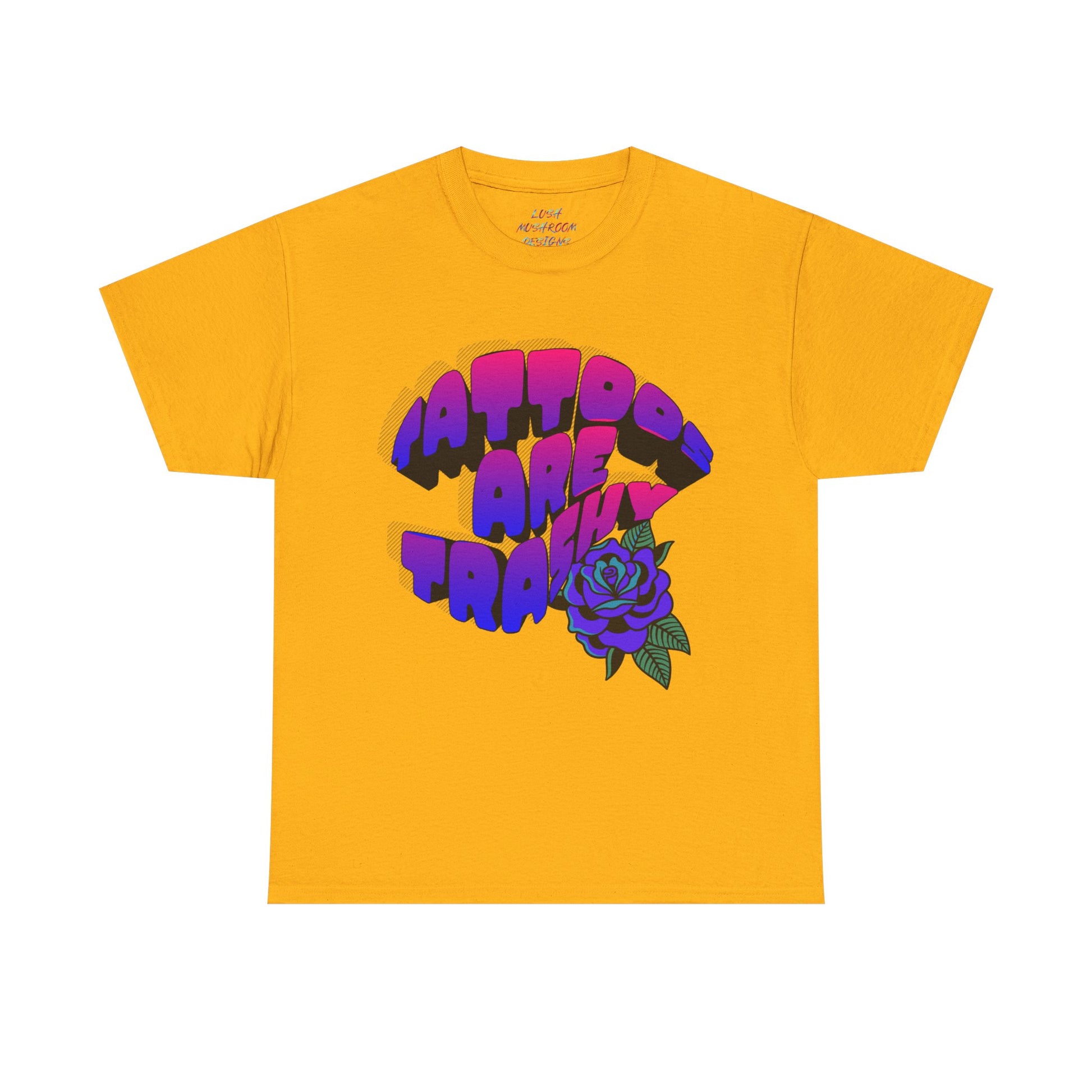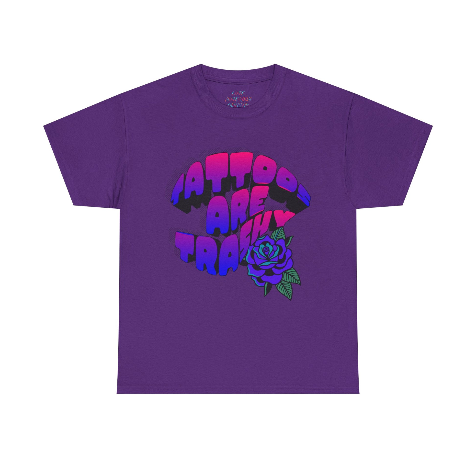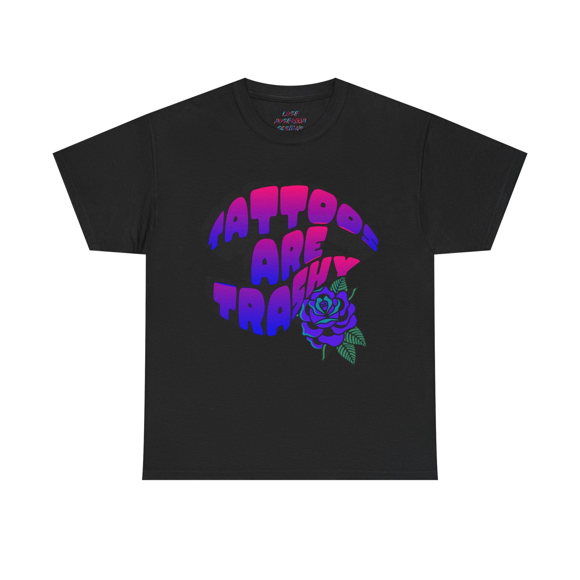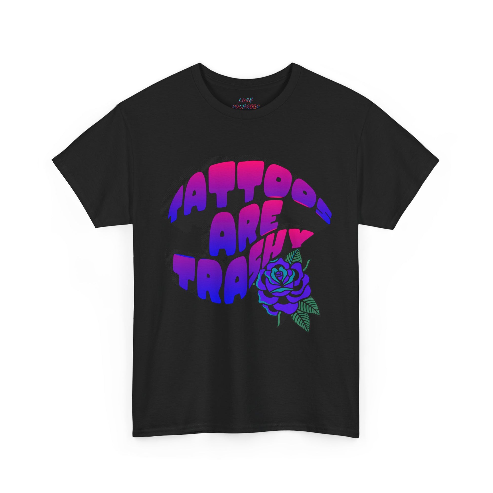 This relaxed-fit tee speaks with a bold, playful edge. A chunky, retro-inspired type reads “Tattoos Are Trashy” in vivid purple-to-pink gradient letters that pop against the clean white cotton, while a deep indigo rose with green leaves adds a punk-floral contrast. The shirt feels lived-in from the first wear — soft, sturdy, and breathable — and the straight crew neckline keeps the look classic so the graphic stays front-and-center. Wear it layered under a denim jacket, with high-waist jeans, or loose with shorts for a slice of streetwise attitude and tongue-in-cheek humor.