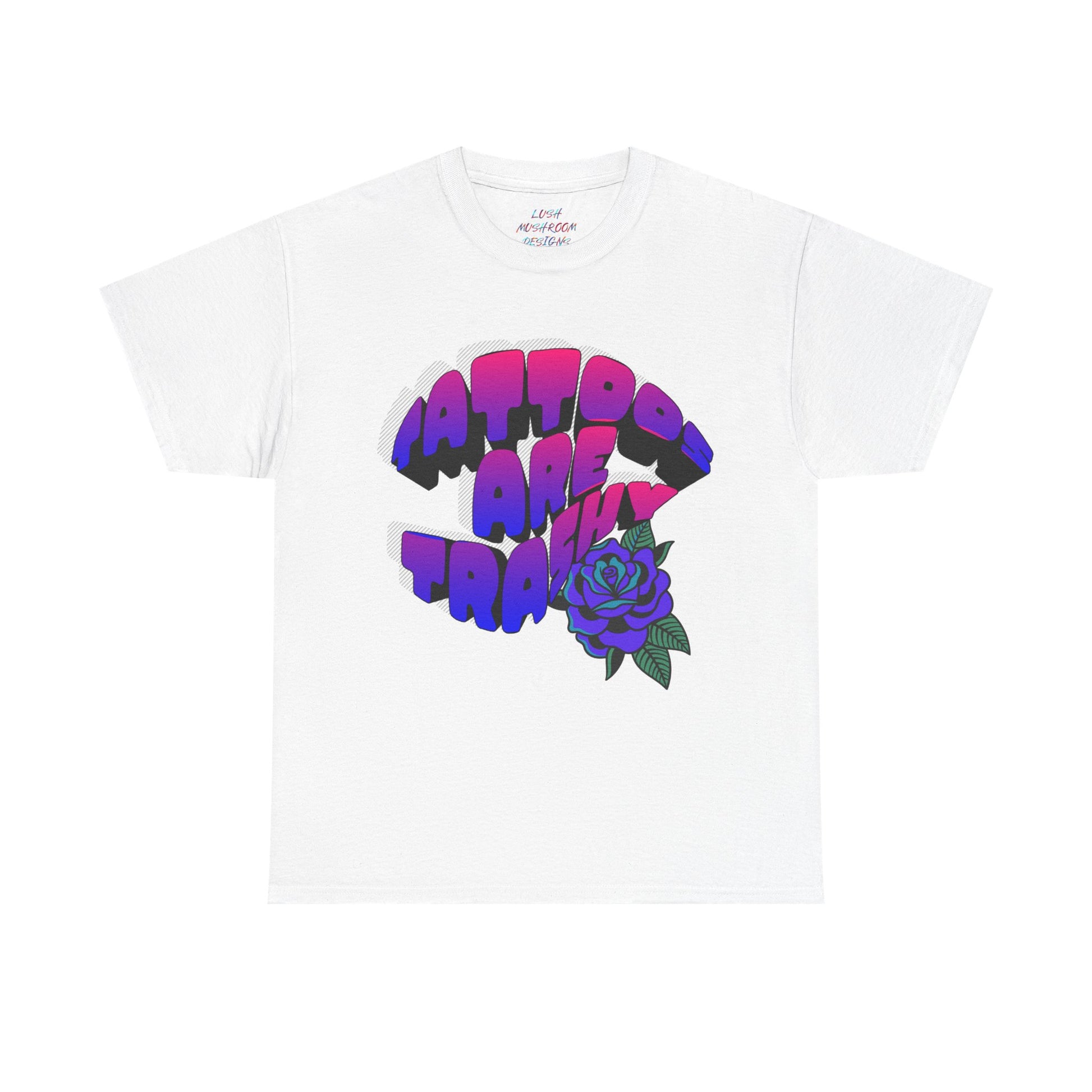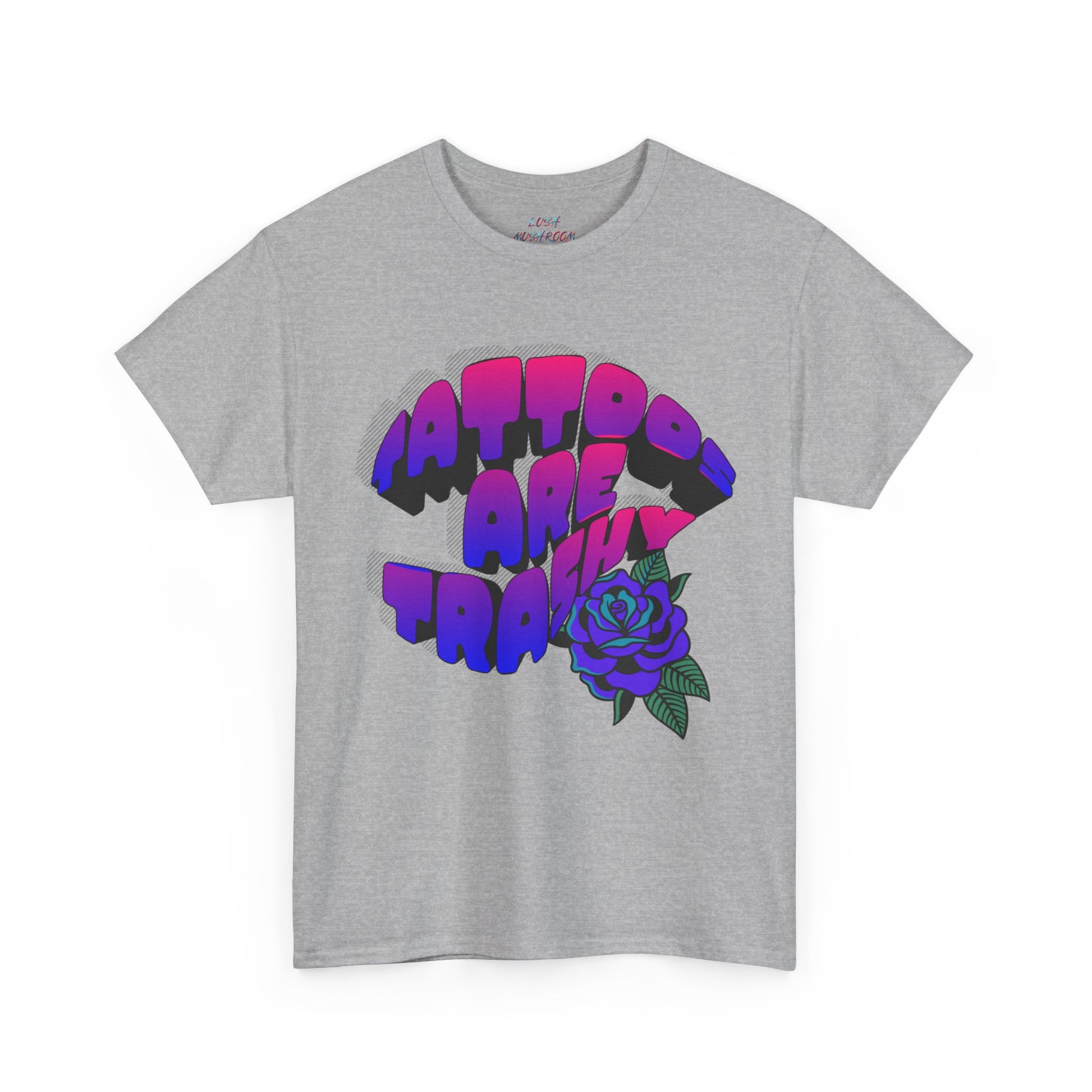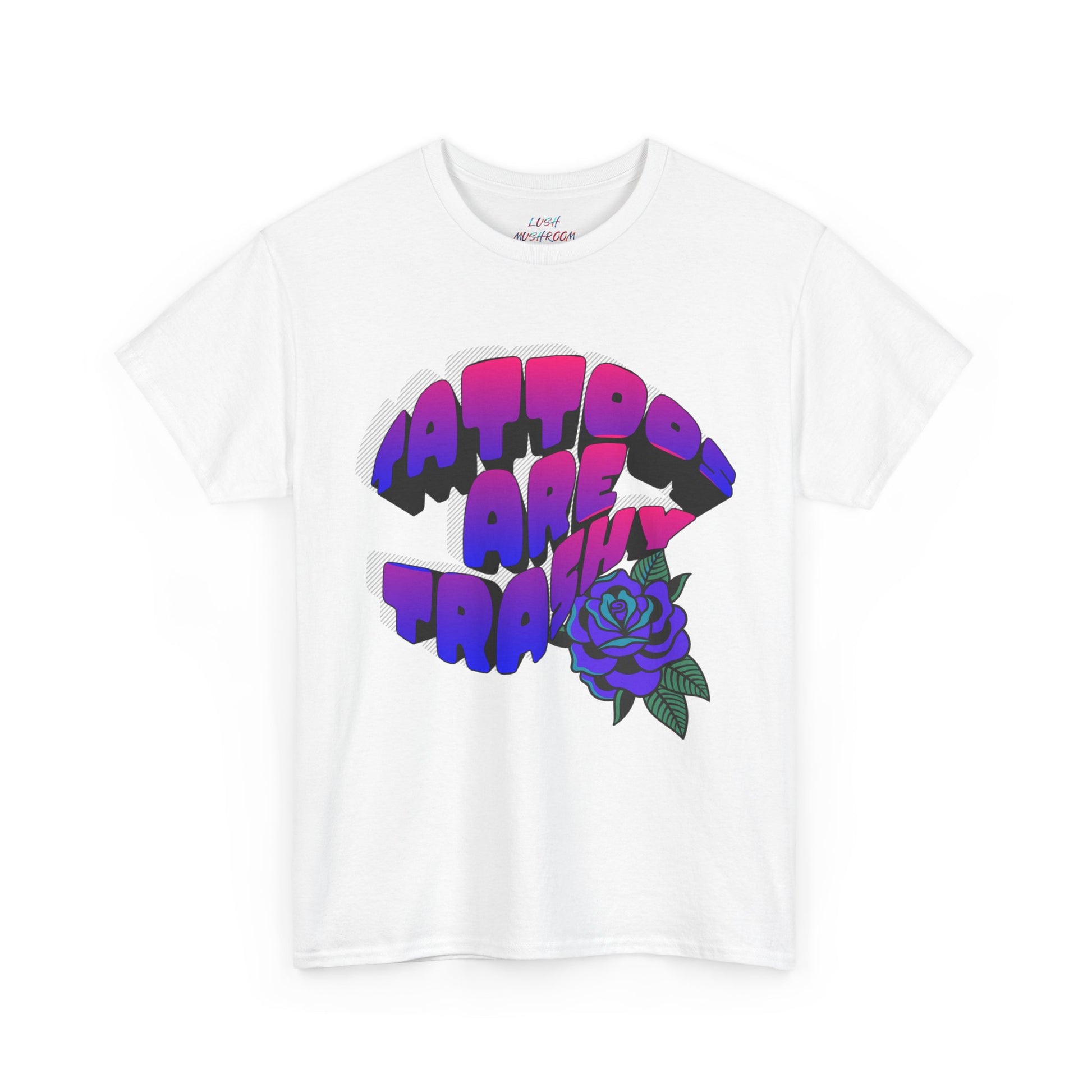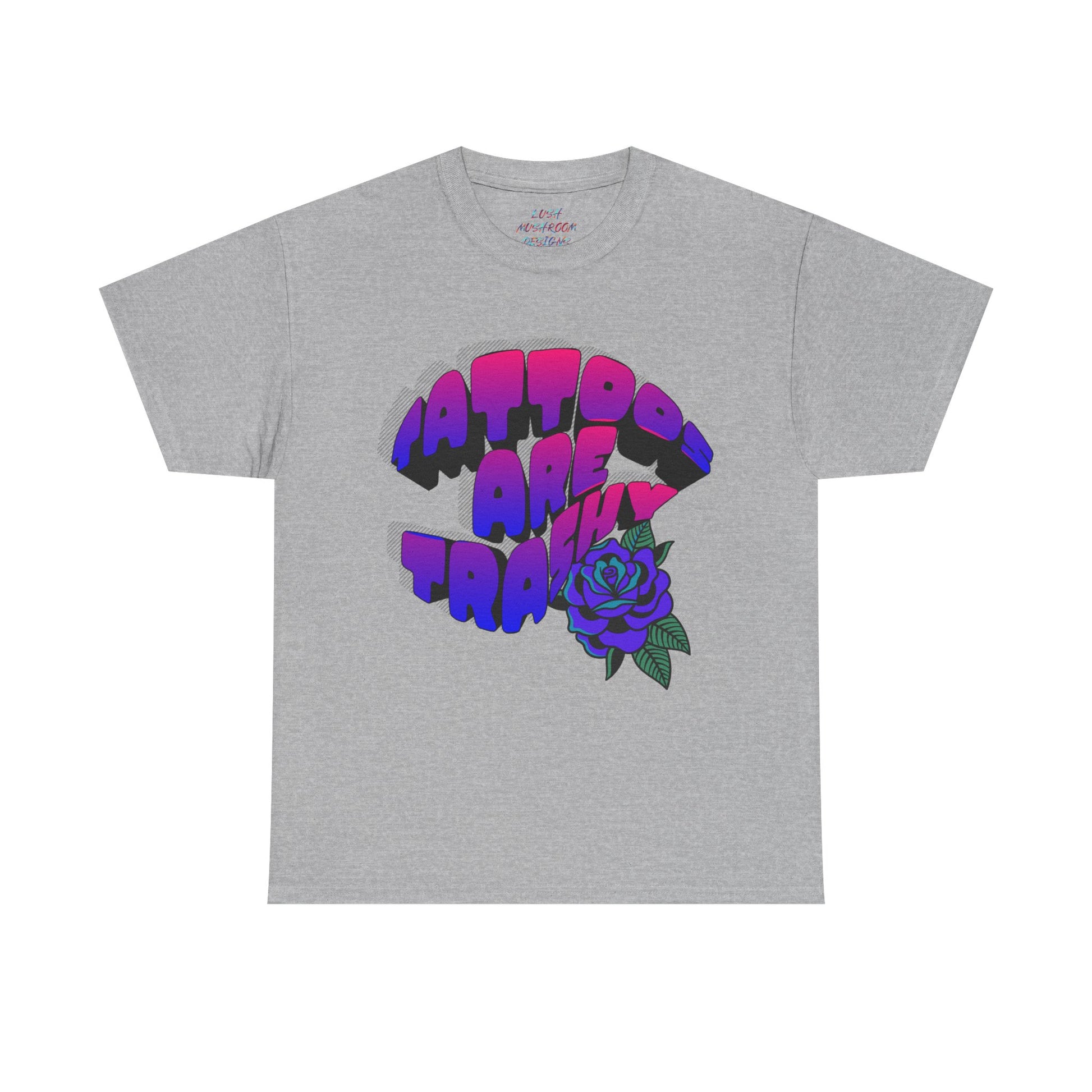 This relaxed-fit tee speaks with a bold, playful edge. A chunky, retro-inspired type reads “Tattoos Are Trashy” in vivid purple-to-pink gradient letters that pop against the clean white cotton, while a deep indigo rose with green leaves adds a punk-floral contrast. The shirt feels lived-in from the first wear — soft, sturdy, and breathable — and the straight crew neckline keeps the look classic so the graphic stays front-and-center. Wear it layered under a denim jacket, with high-waist jeans, or loose with shorts for a slice of streetwise attitude and tongue-in-cheek humor.